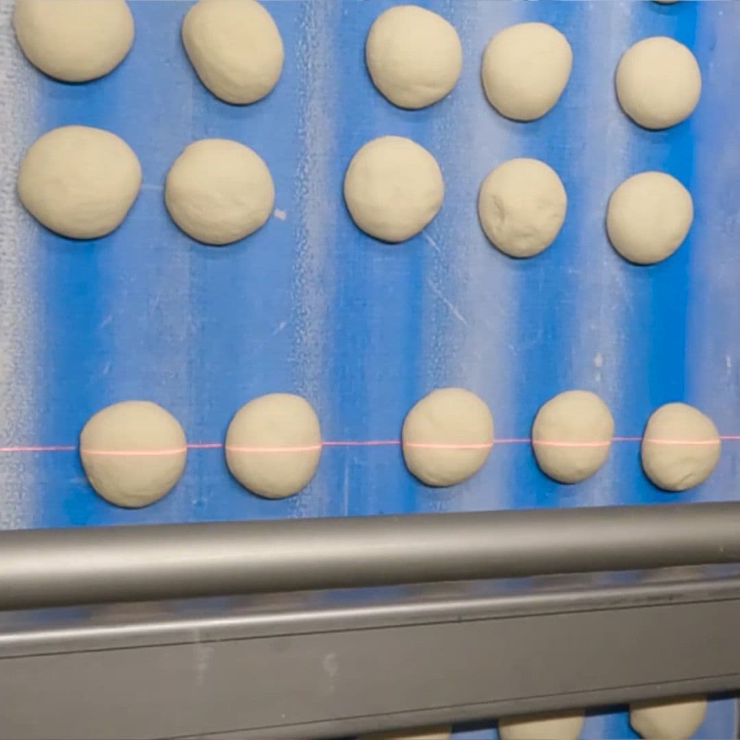 The dough pieces are conveyed under the 3-D vision sensor via a floured conveyor belt.