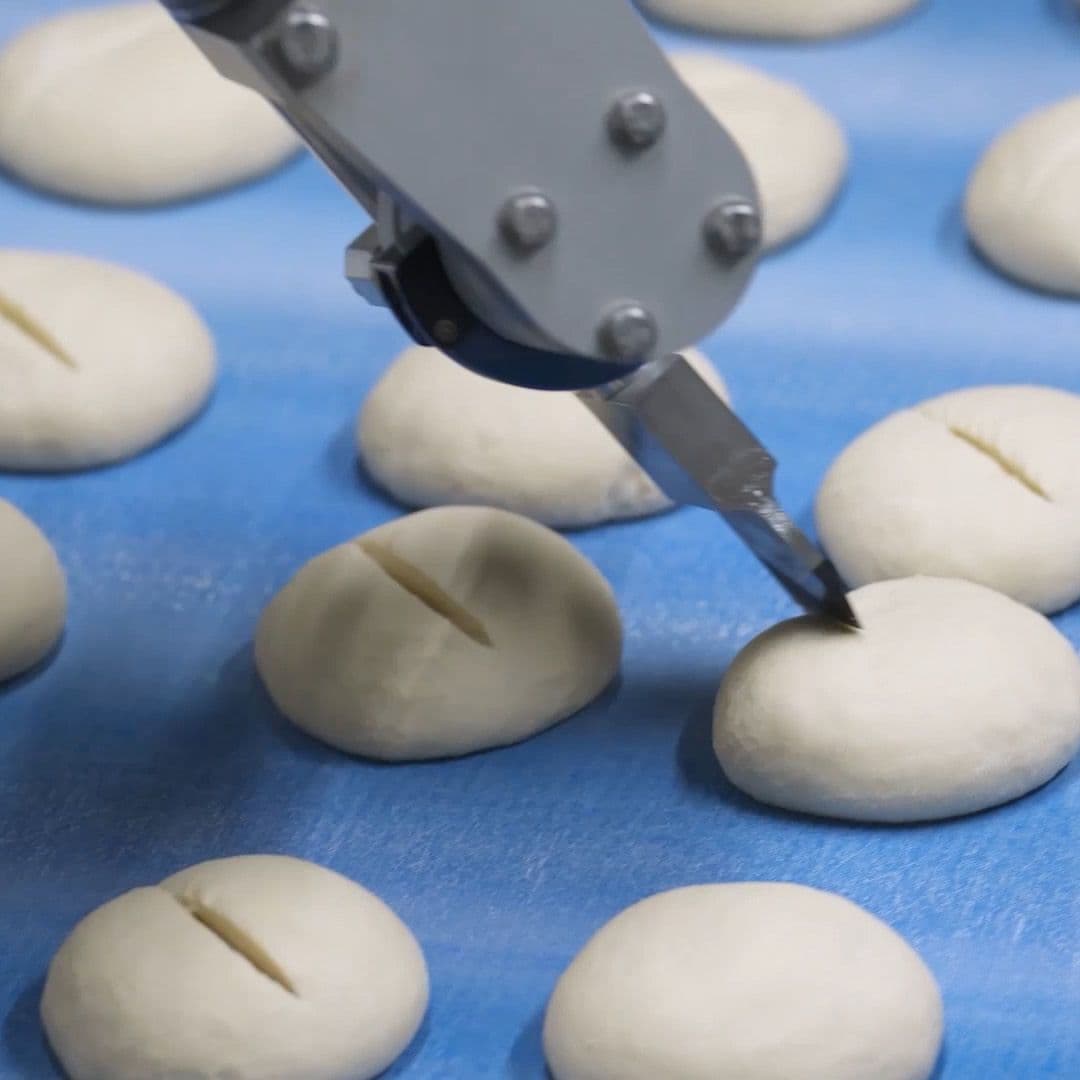 The ultrasonic knives with reduced cutting force guarantee that the dough pieces do not slip on the floured conveyor belt.