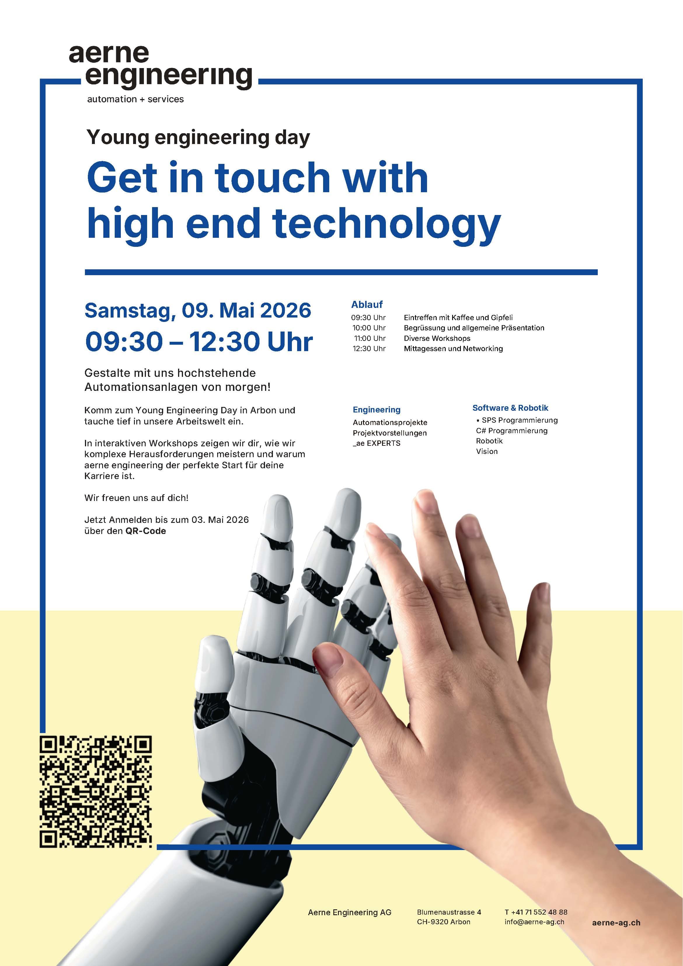 Am 9. Mai 2026 öffnen wir in Arbon unsere Türen für Studierende und zukünftige Lernende. Beim YED 2026 geben wir Einblick in unsere Arbeitswelt und zeigen, wie aus Anforderungen funktionierende Automationsanlagen entstehen. Drei Stunden nah dran an Technik, die in der Praxis läuft. Wer mitbauen will, ist hier richtig.